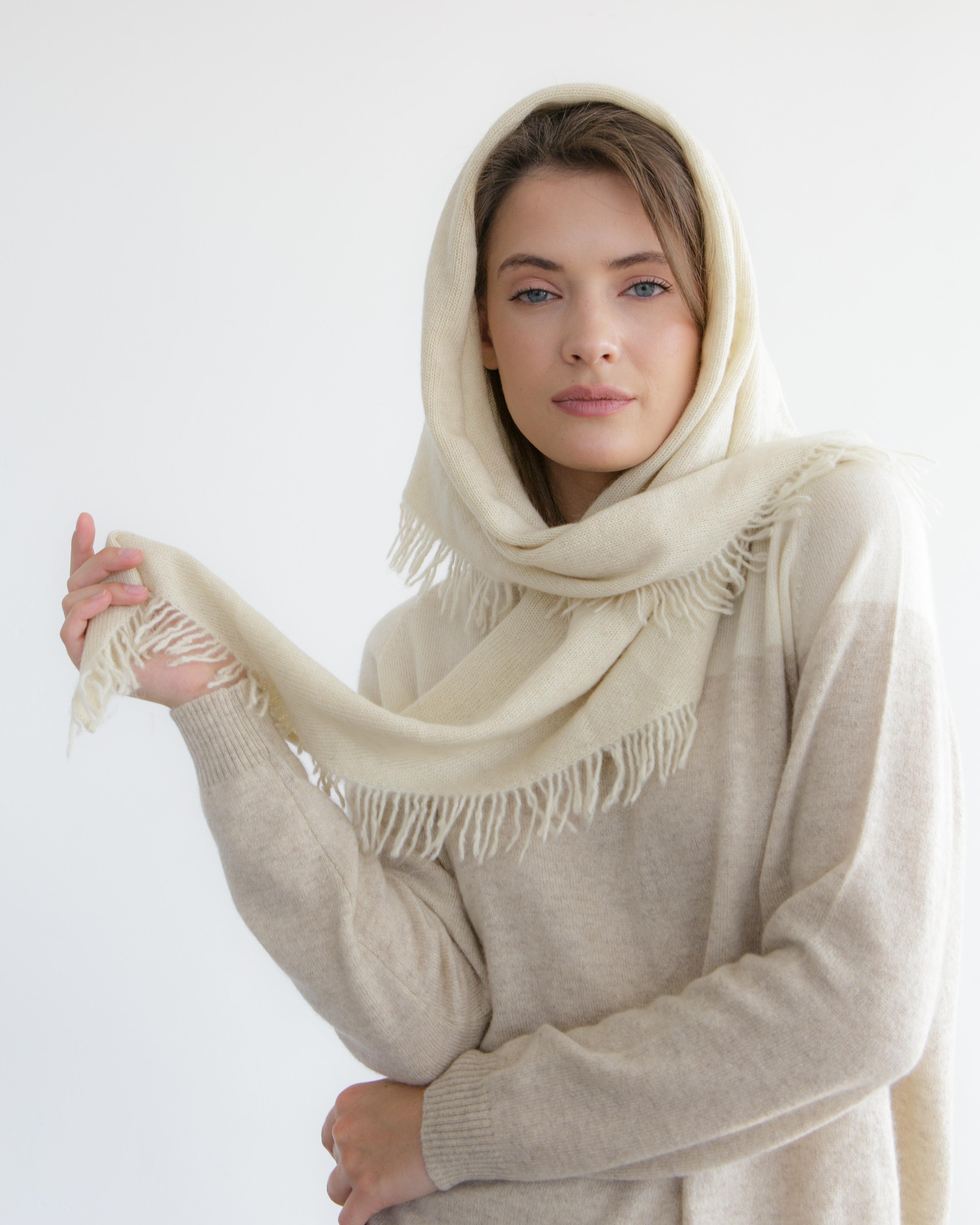 При заказе обратите внимание : цвет косынки не белый, как на фото. Косынка цвета натуральной не отбеленной шерсти - бежевая (сероватая).