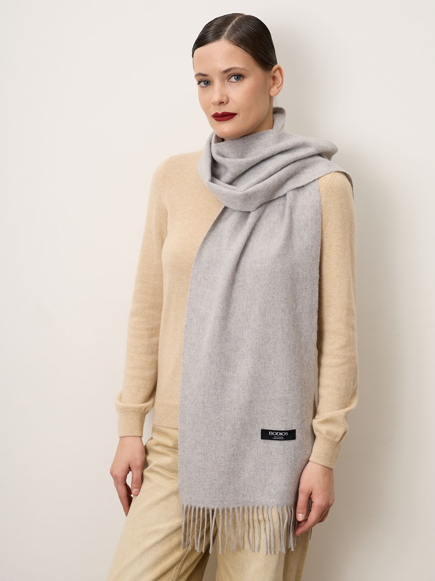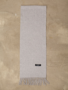 Классический прямоугольный формат с аккуратной отделкой и деликатной бахромой по краям. Лаконичный дизайн без лишнего декора делает шарф универсальным и актуальным вне времени. Оптимальная длина позволяет носить его свободно на плечах или оборачивать вокруг шеи.