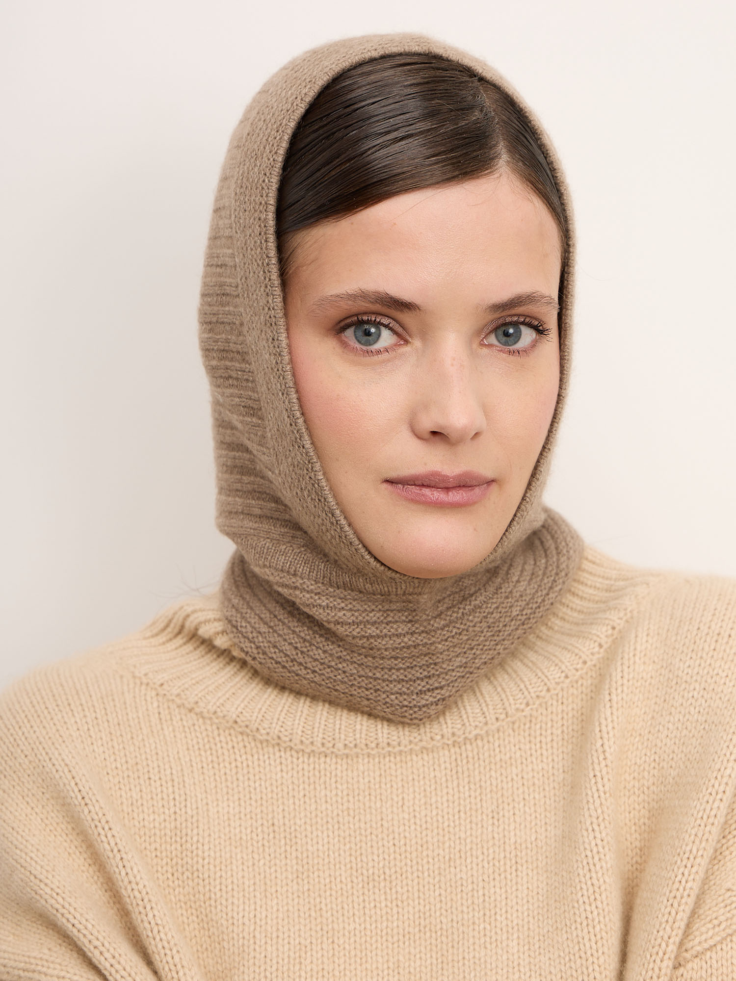 Балаклава из кашемира в оттенке капучино — это современный акцент, который объединяет эстетику, комфорт и естественную теплоту натурального волокна.