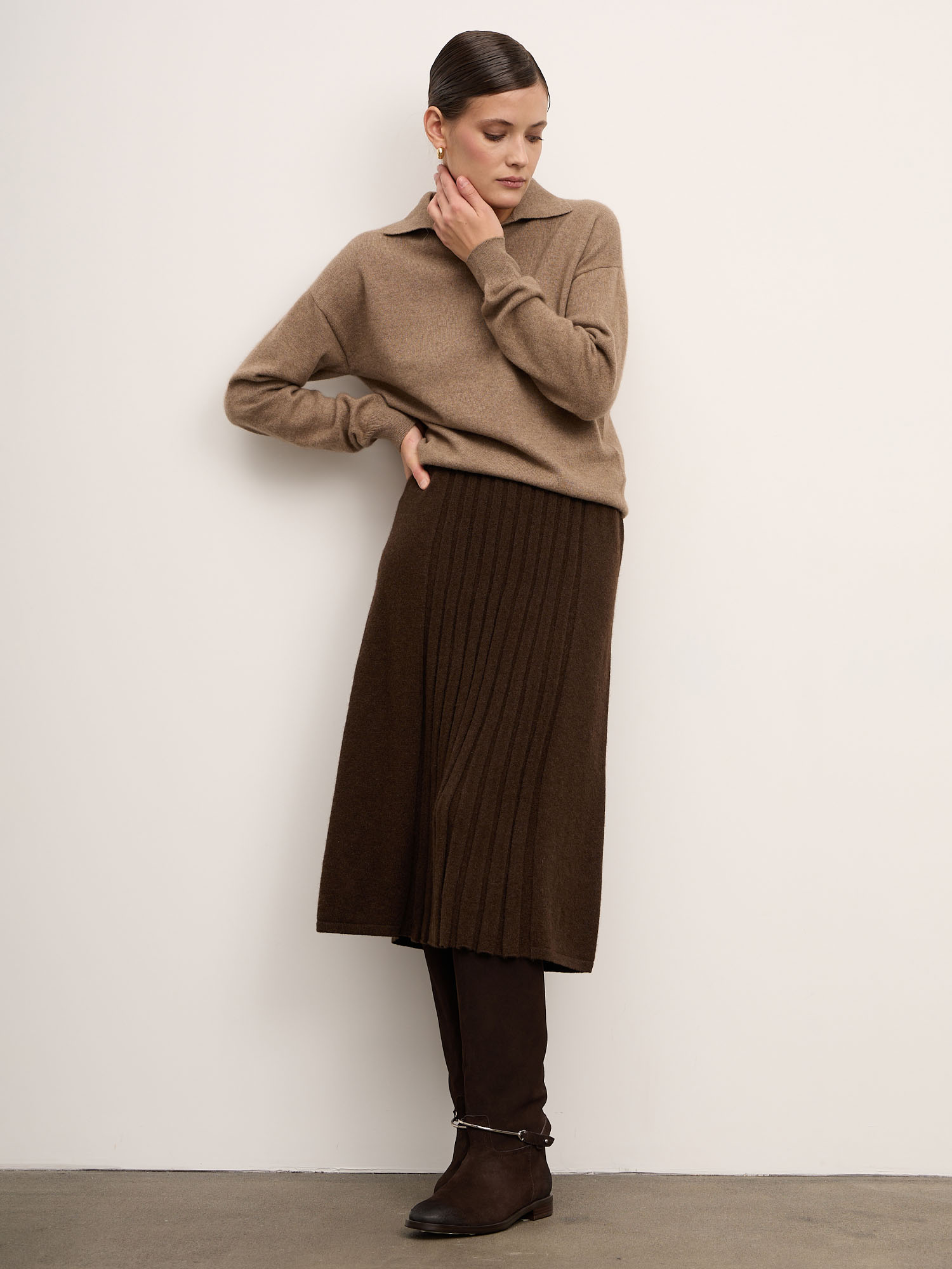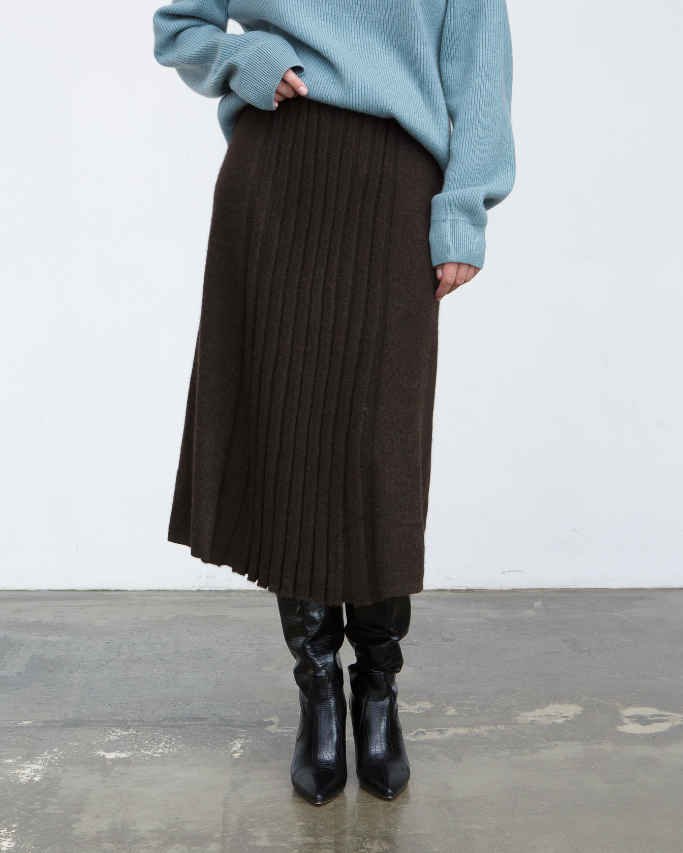 Плиссированная структура по всей длине придаёт юбке лёгкость и визуальную глубину. Модель имеет классический прямой силуэт с мягким расширением книзу.