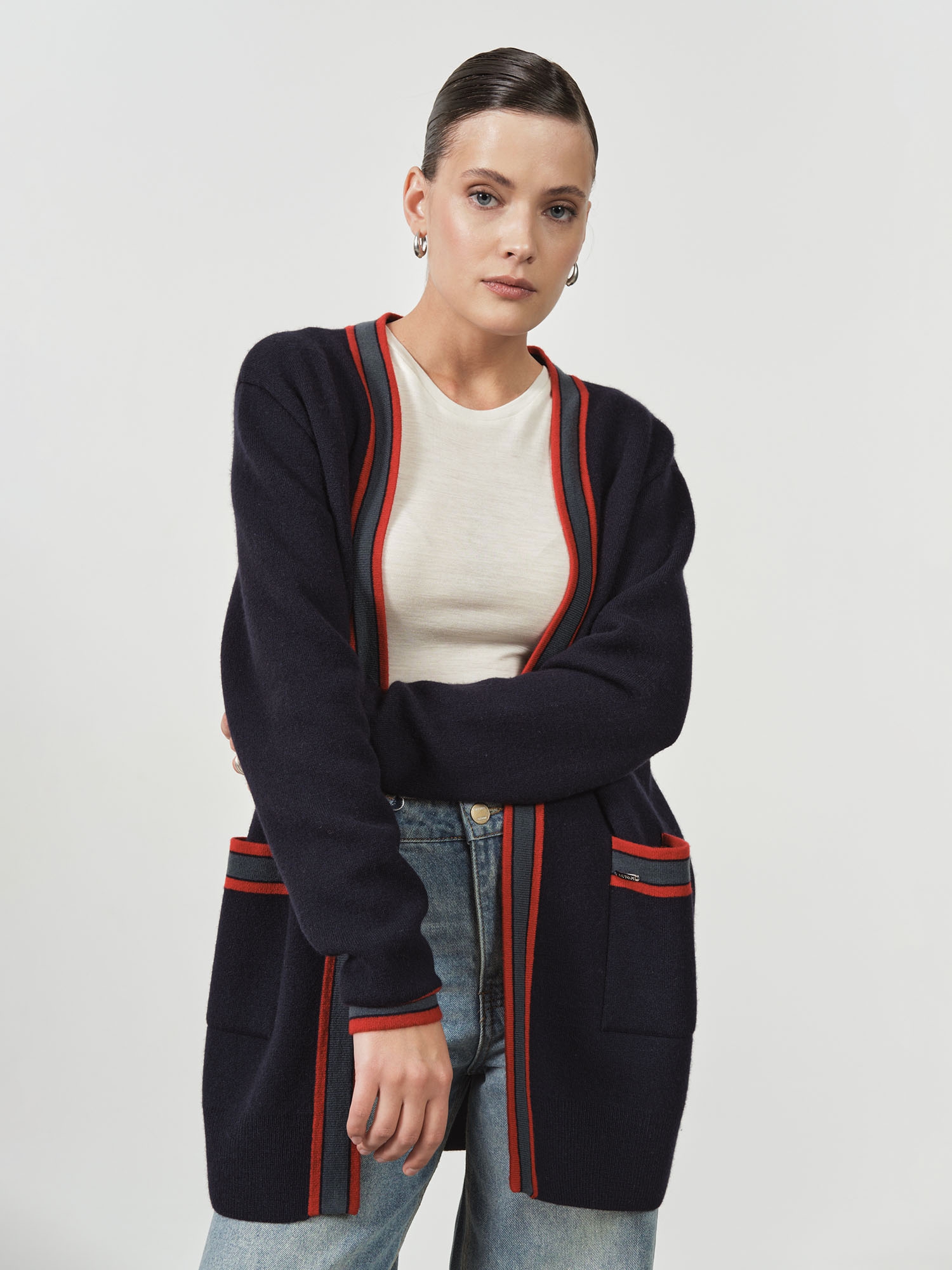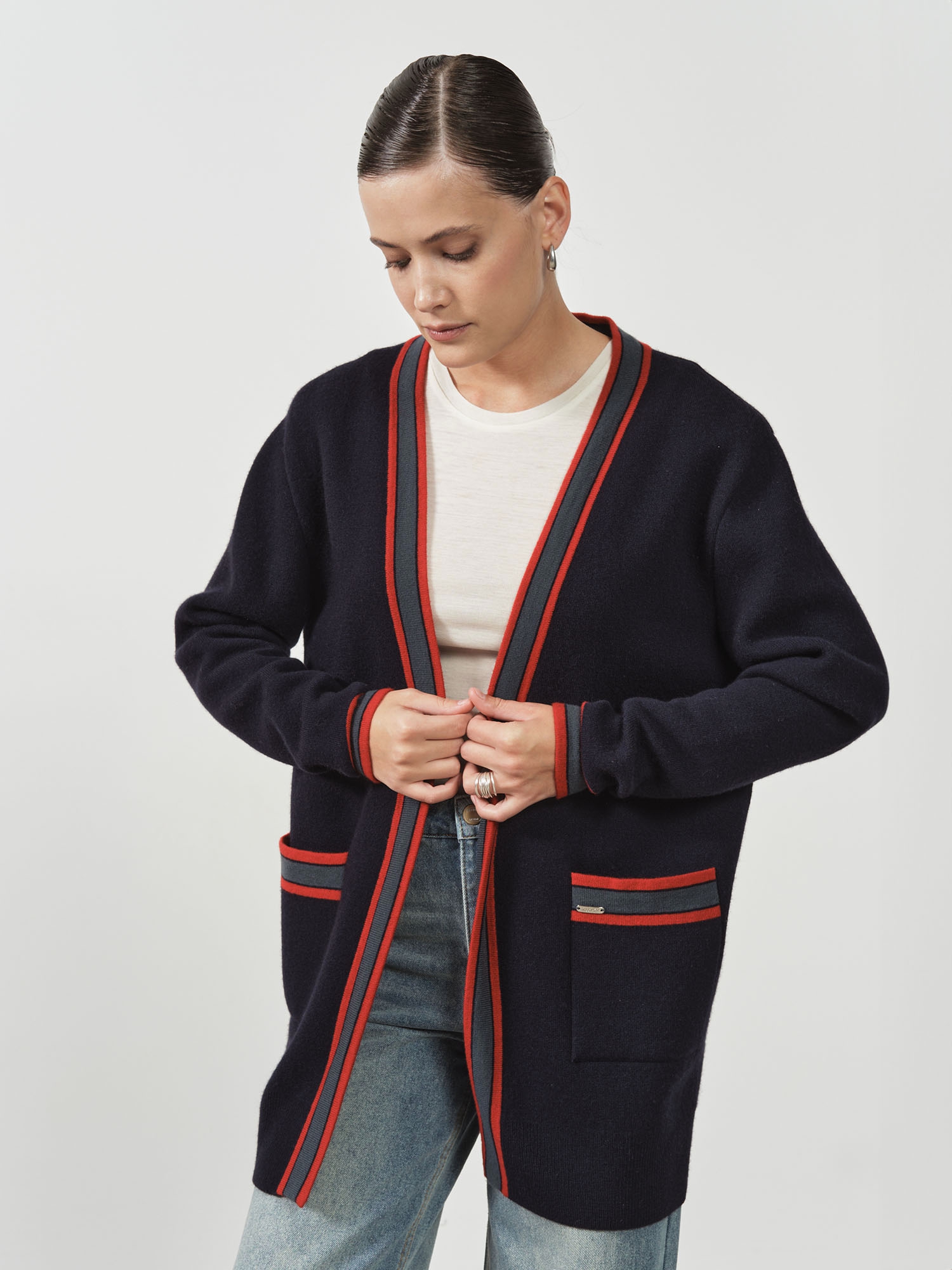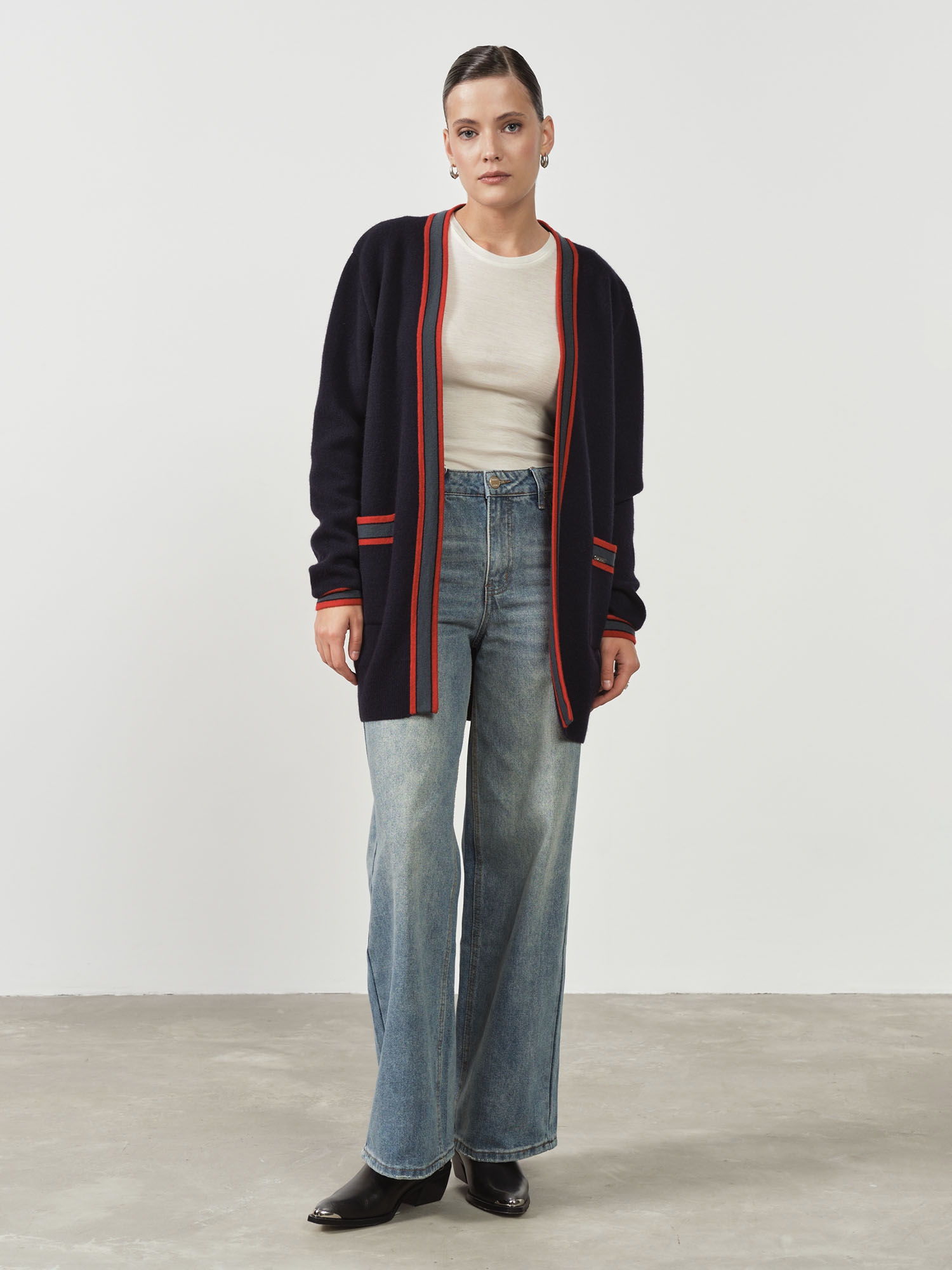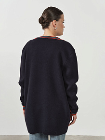 Контрастная отделка по краям, планке и карманам придает модели графичность и современный характер. Открытый фасон без застежки делает кардиган универсальным для многослойных образов.