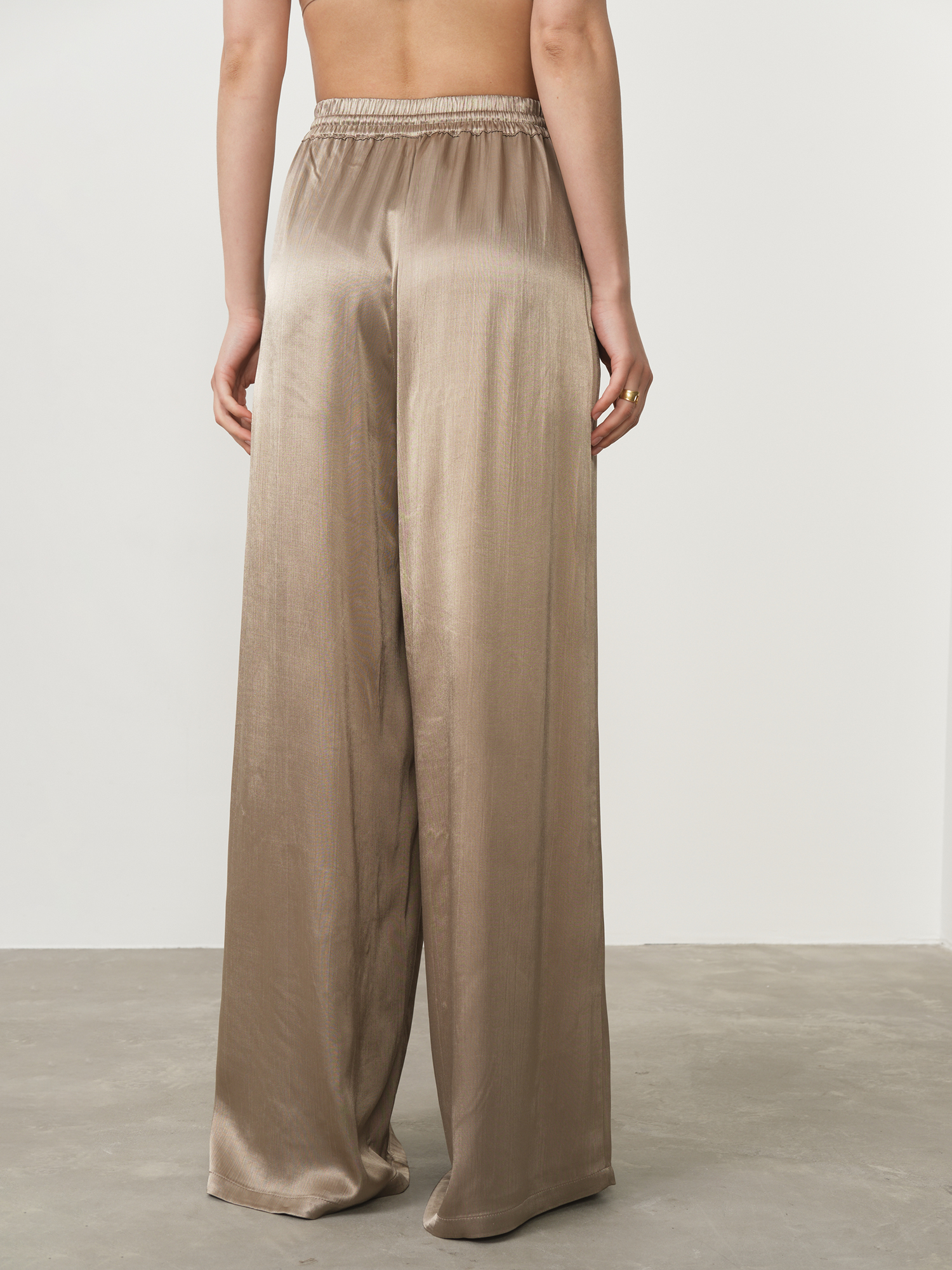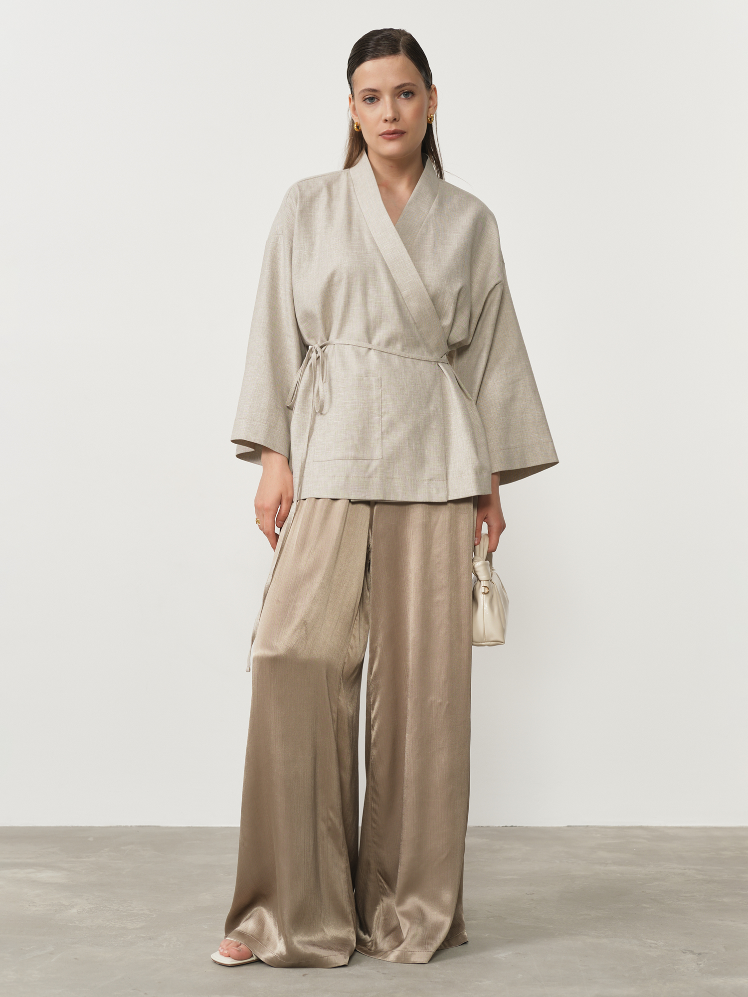 Свободный прямой крой с акцентом на лёгкость и плавность линий. Брюки визуально вытягивают силуэт и создают ощущение невесомости.