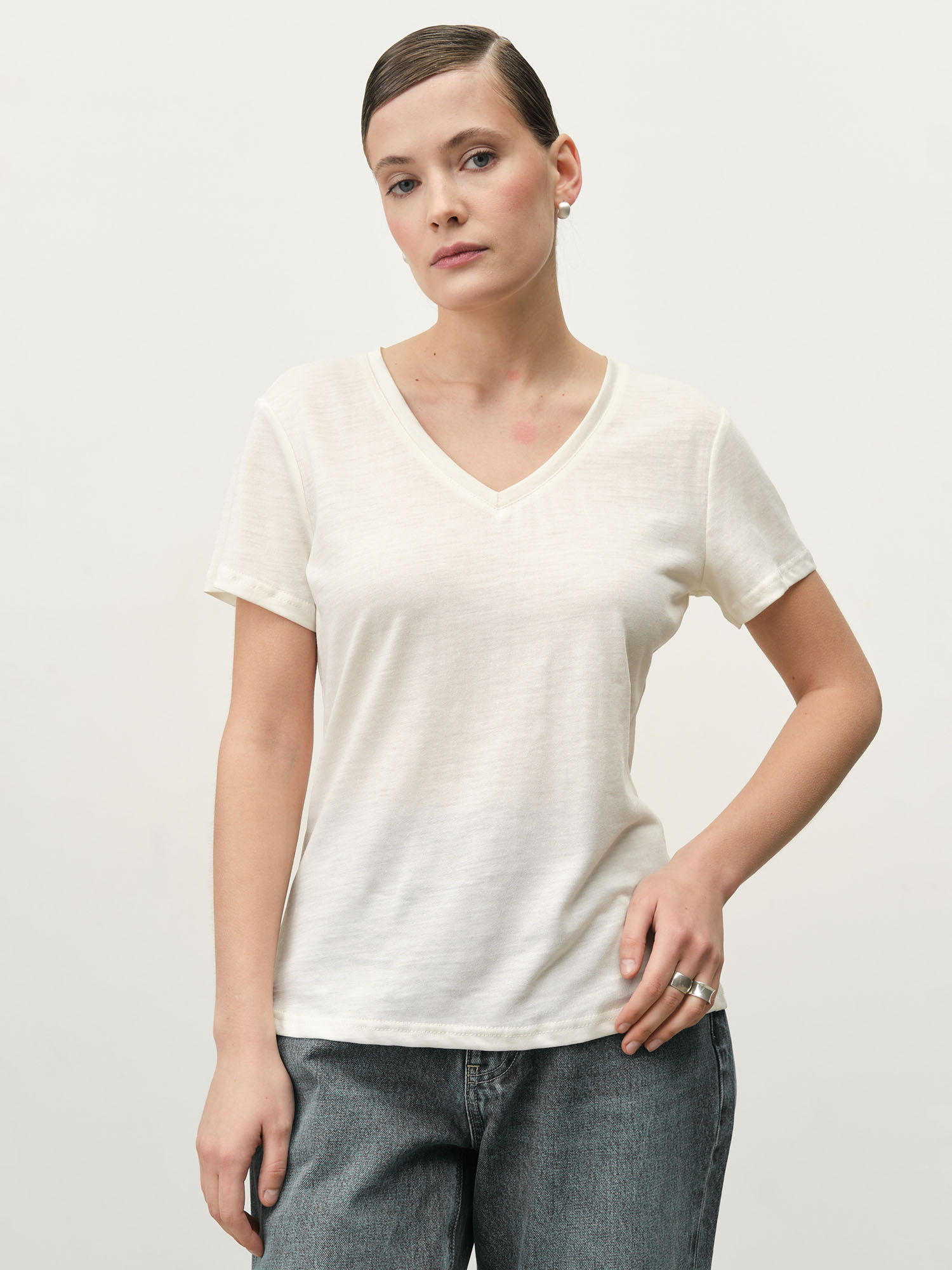 Прямой силуэт с V-образным вырезом, который визуально вытягивает линию шеи. Лаконичный крой делает модель базовой и универсальной.