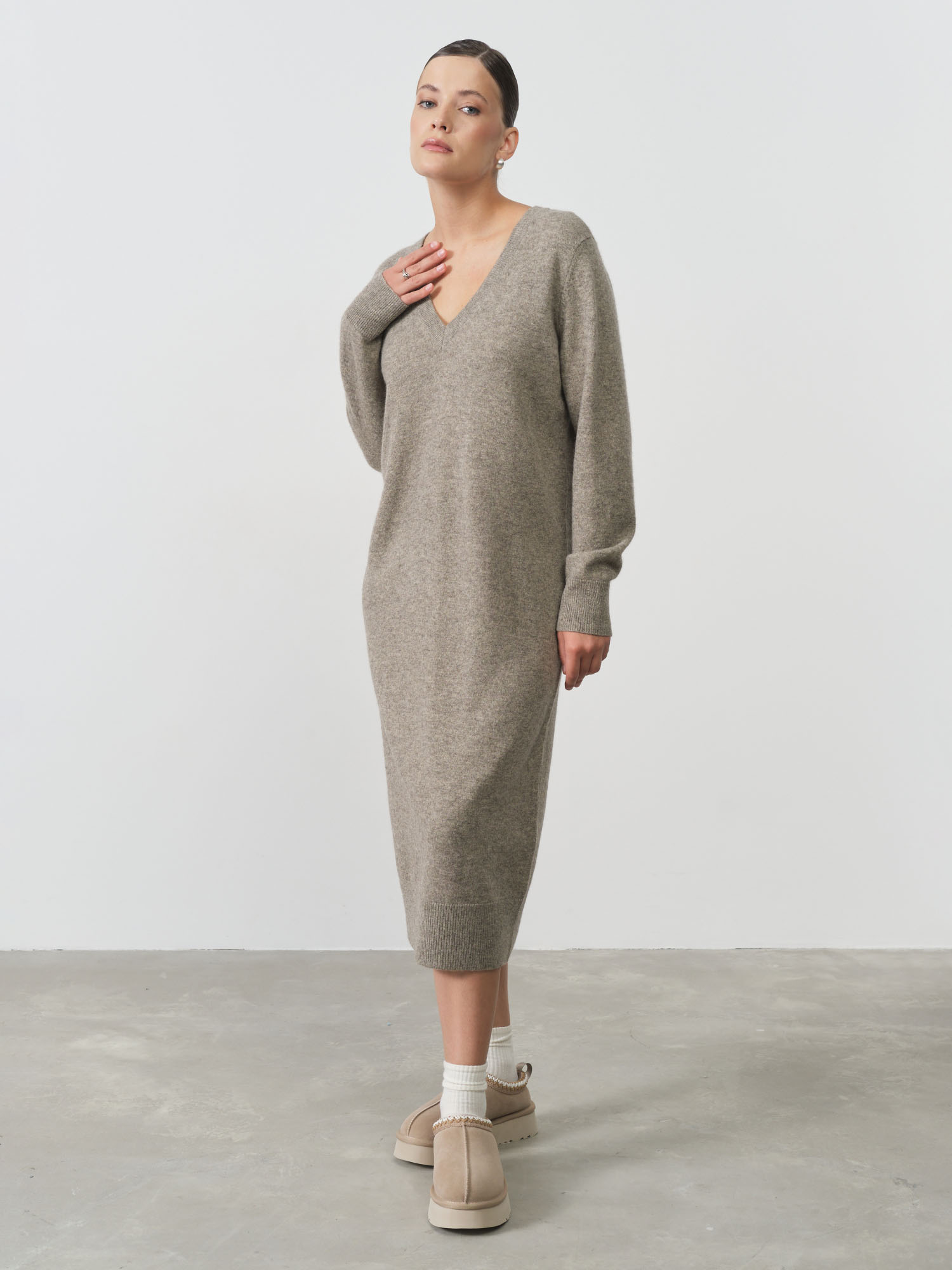 Платье из пуха яка — комфортная и стильная модель в духе современного минимализма. Свободный силуэт и мягкая фактура создают расслабленный, но элегантный образ, идеально подходящий для повседневной носки.