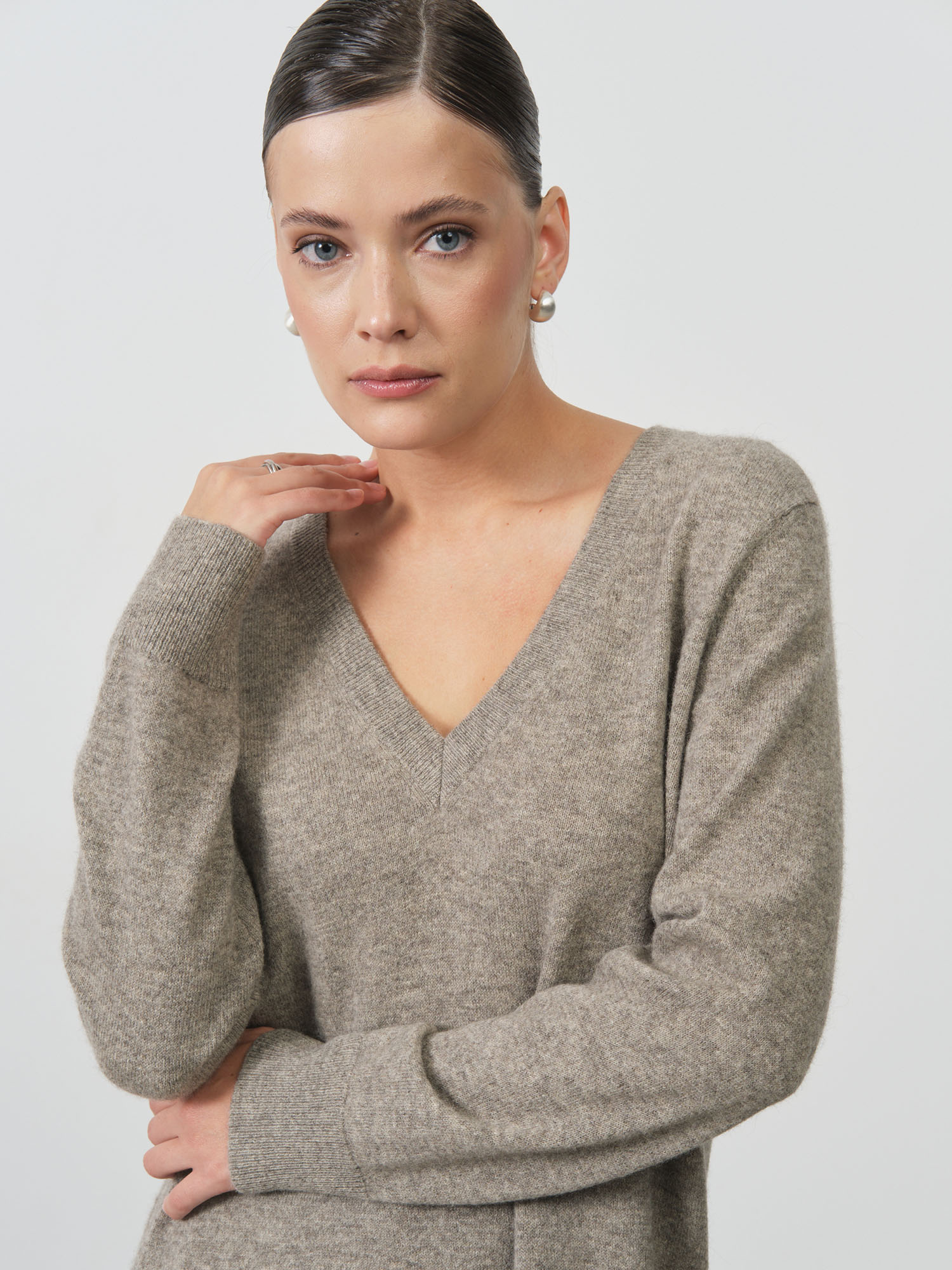 Модель выполнена в свободном прямом силуэте с V-образным вырезом и длинными рукавами. Лаконичный крой подчёркивает универсальность и современный стиль изделия.