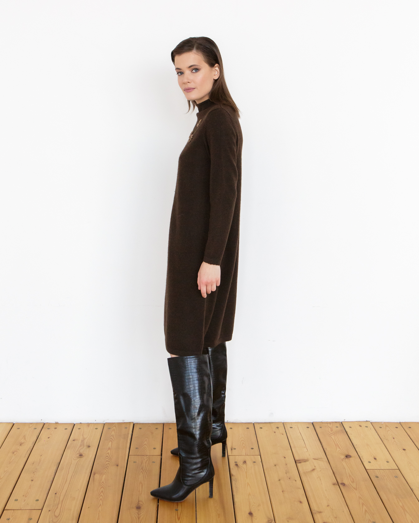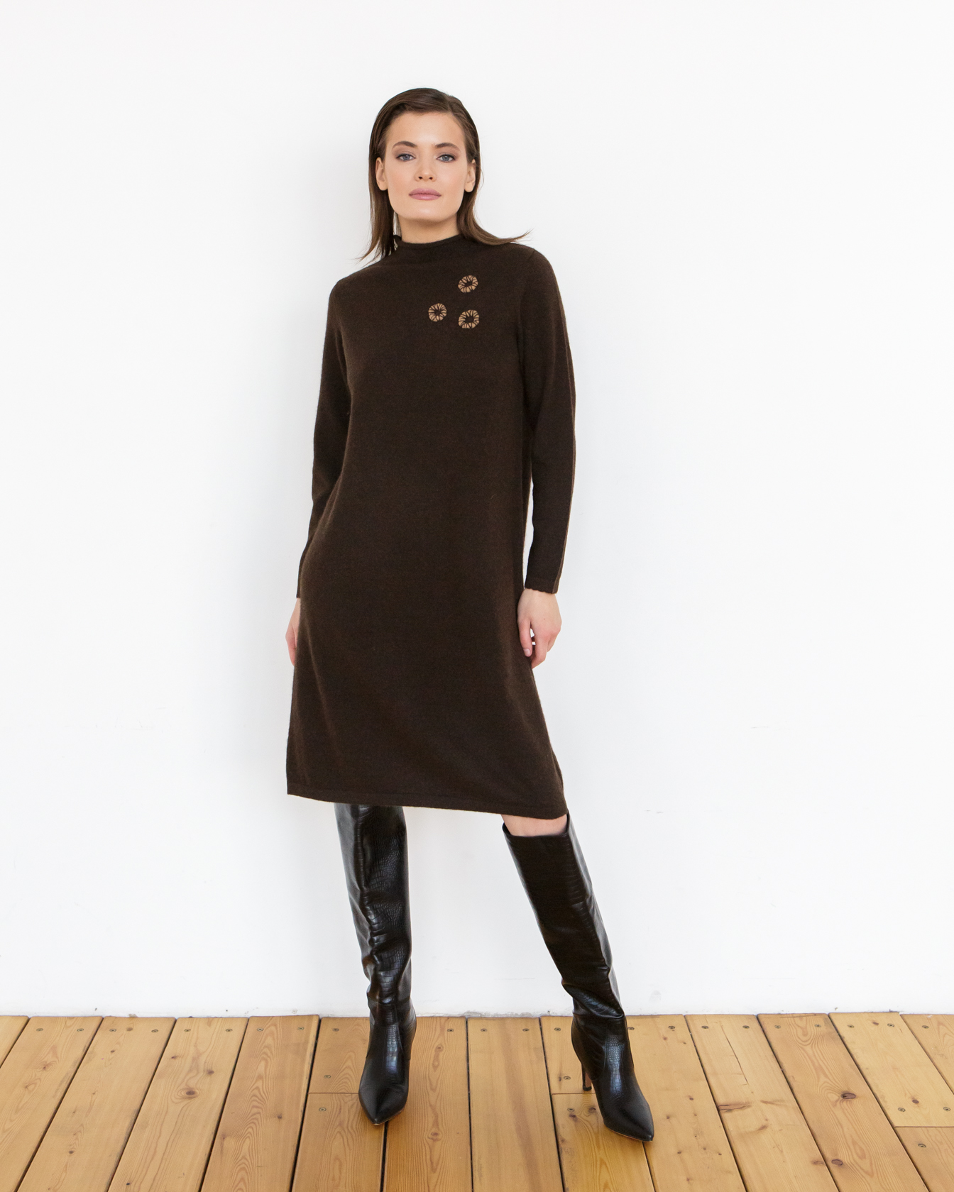 Платье гармонично сочетается с высокими сапогами, ботильонами или классической обувью. Подходит для офисных образов, встреч и повседневной носки.